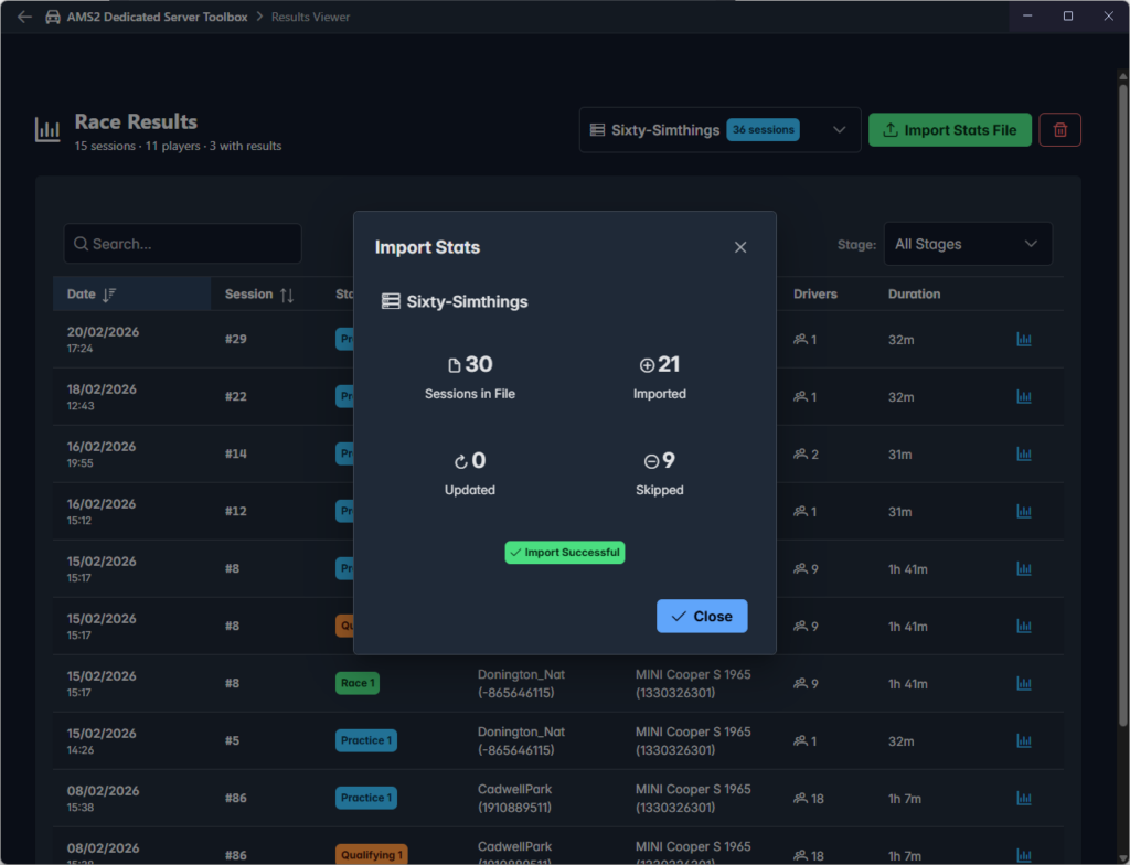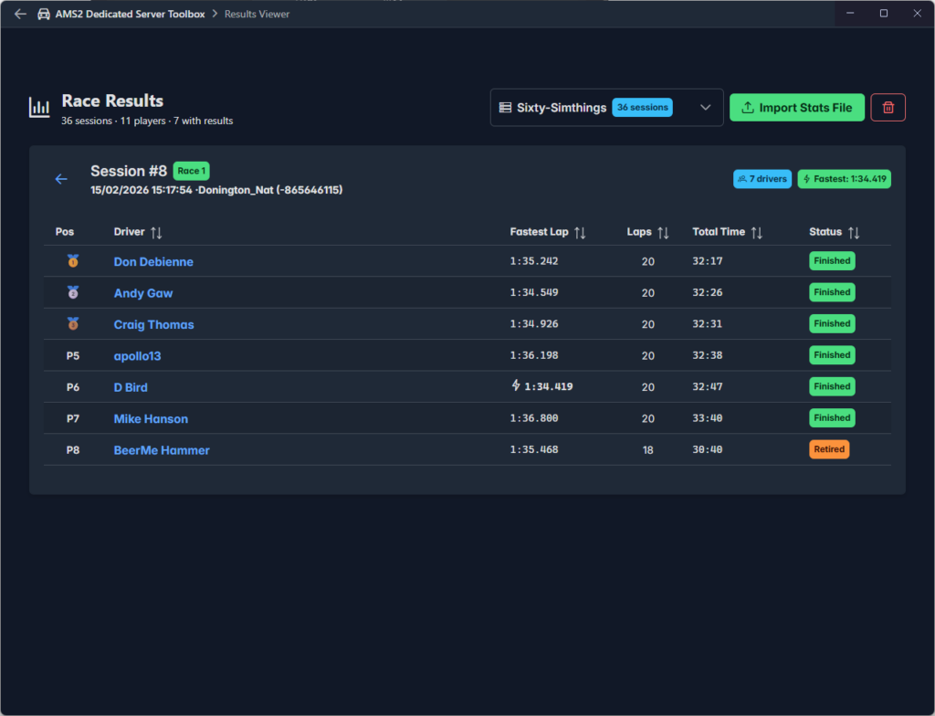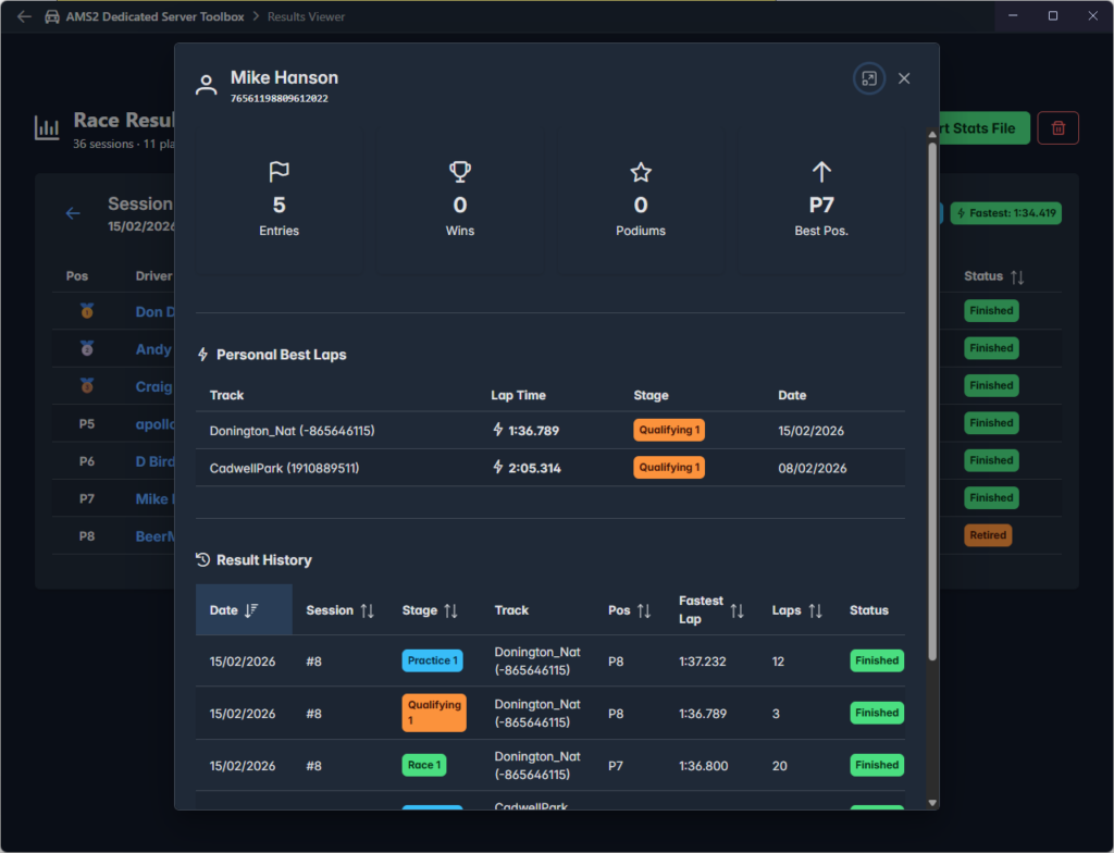 AMS 2 Dedicated Server provides the Results Viewer to help you record and analyse the results of events run on your dedicated server. It uses data available in the data file created by the sms_stats Lua plugin, which it captures into a database maintained by the application. Results Viewer takes care not to create duplicate results using index values included in the file.