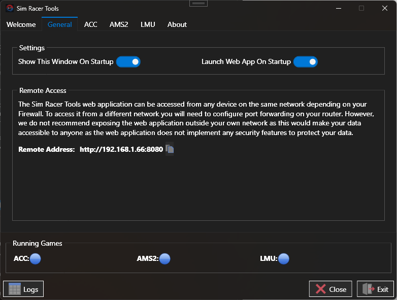 One of the goals for Sim Racing Tools (SRT) was to make it possible to access the tools remotely, that is from another device or computer on the same network as your driving rig. To achieve this we decided to create a background app (a server like app) that runs on your driving rig to capture data from the games, then embed a web application within that application.